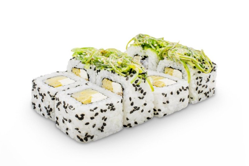 8 шт. Рис, сыр творожный, омлет томаго, салат чука, соус кунжутный, лист нори. В комплекте: соевый соус - 1, васаби -1, имбирь - 1